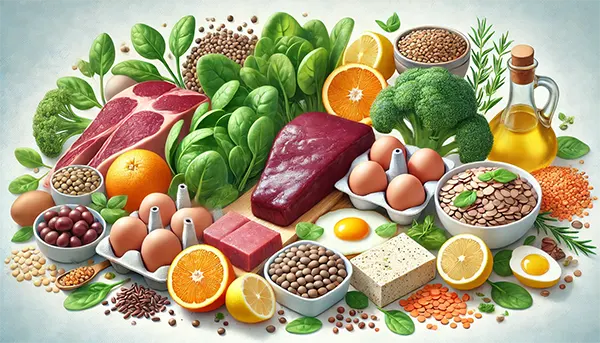 철분이 풍부한 시금치, 간, 붉은 육류가 좋으며, 비타민 C가 많은 과일과 함께 섭취하면 흡수율이 높아집니다.
