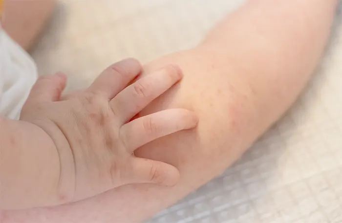 주로 손바닥, 발바닥, 손가락, 발가락에 작은 빨간 반점이나 물집이 생기는데요.물집은 투명하거나 흰색의 액체로 채워져 있으며, 크기는 보통 2~3mm 정도로 매우 작습니다.발진은 종종 엉덩이, 다리, 무릎, 팔 등 다른 부위로도 퍼질 수 있으며, 가려움증을 동반하기도 합니다.