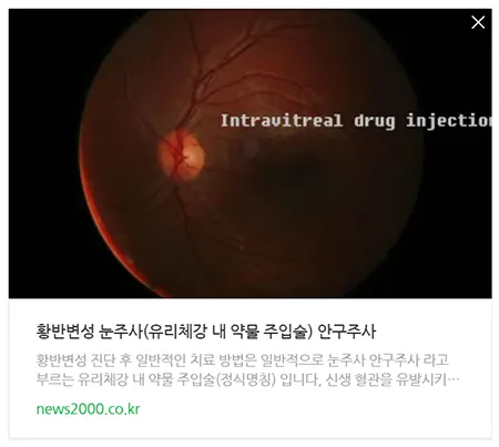 • 신생 혈관 성장을 억제하고 부종을 줄이는 데 효과적이며 가장 일반적인 치료 방법입니다.